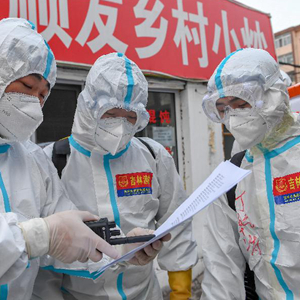 3月18日,吉林市黨員志愿者張騫文(左)在社區核酸檢測采樣點(diǎn)為居民掃碼登記。