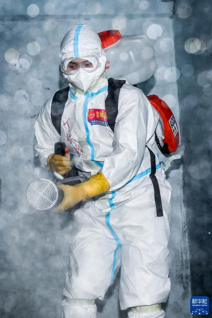3月18日,吉林市消防救援支隊黨員先鋒突擊隊隊員丁乾濤在居民樓內進(jìn)行消殺作業(yè)。