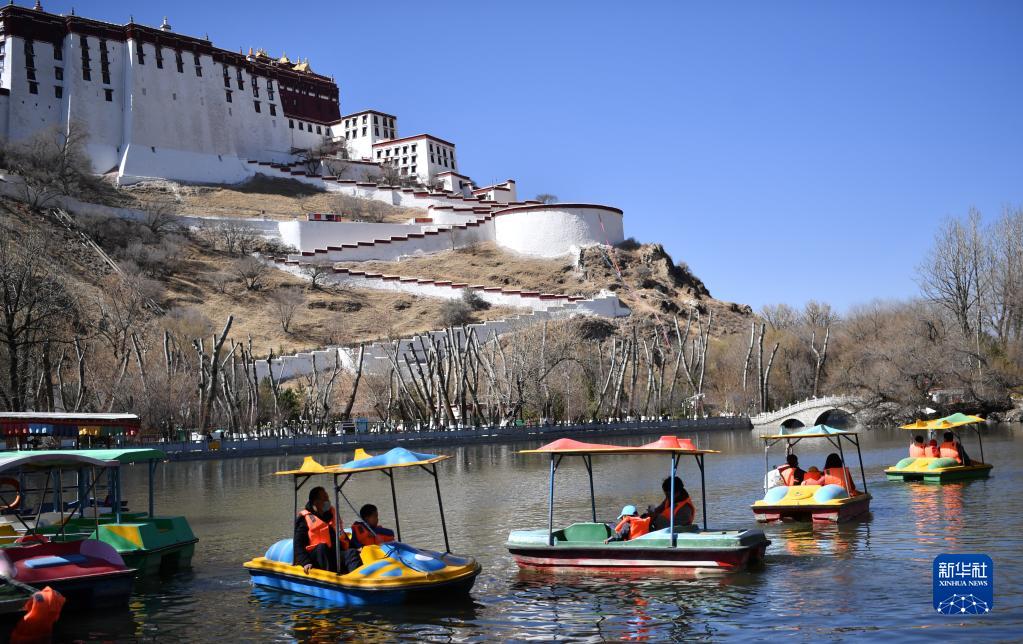 3月20日,在布達拉宮腳下的龍王潭公園內,游客乘船游玩。