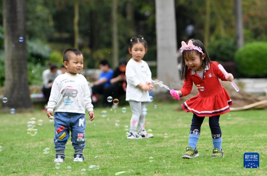 3月20日,小朋友在廣西南寧市金花茶公園玩耍。