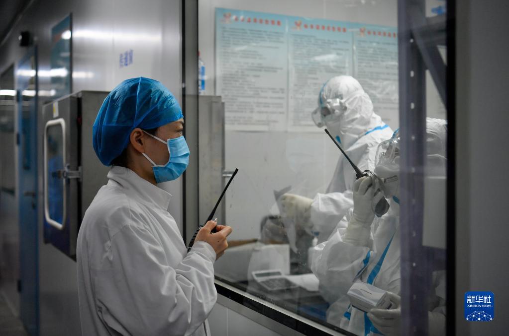 3月19日,在天津市河北區城市核酸檢測基地內,PCR檢測室組長(cháng)馬晉(左)通過(guò)對講機與實(shí)驗室內的工作人員溝通。