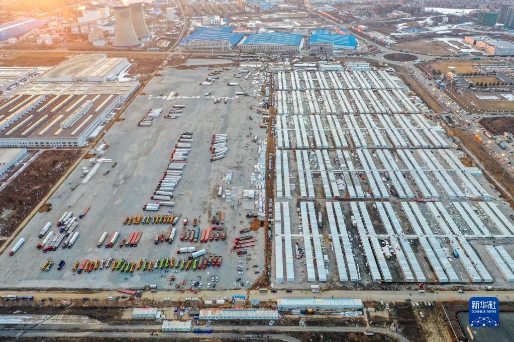 這是3月20日傍晚拍攝的吉林市高新南區隔離方艙建設現場(chǎng)(無(wú)人機照片)。