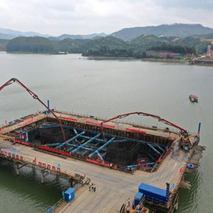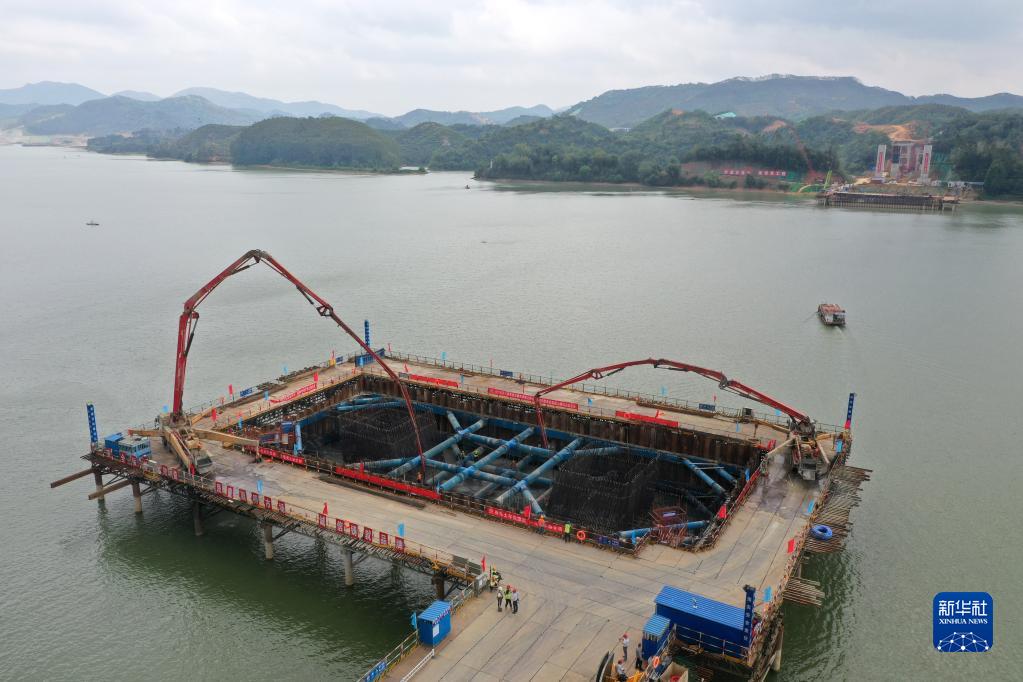 當日,在廣西上林至橫州高速公路建設施工現場(chǎng),工人們加班加點(diǎn)完成控制性工程——西津郁江特大橋水中承臺的澆筑作業(yè)。
