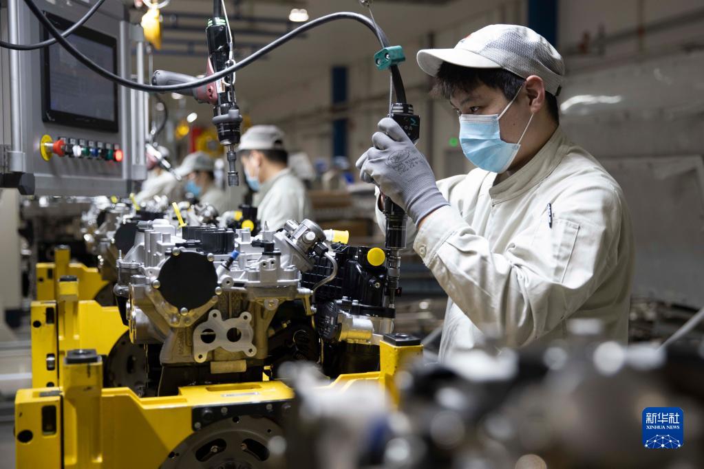 3月23日,工人在哈爾濱東安汽車(chē)動(dòng)力股份有限公司生產(chǎn)車(chē)間內進(jìn)行裝配作業(yè)。
