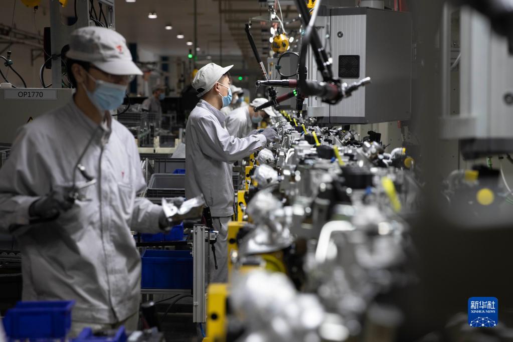 3月23日,工人在哈爾濱東安汽車(chē)動(dòng)力股份有限公司生產(chǎn)車(chē)間內進(jìn)行裝配作業(yè)。