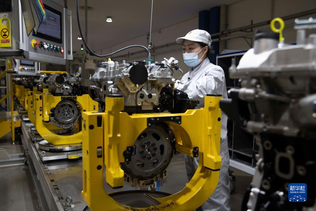 3月23日,工人在哈爾濱東安汽車(chē)動(dòng)力股份有限公司生產(chǎn)車(chē)間內進(jìn)行裝配作業(yè)。