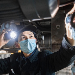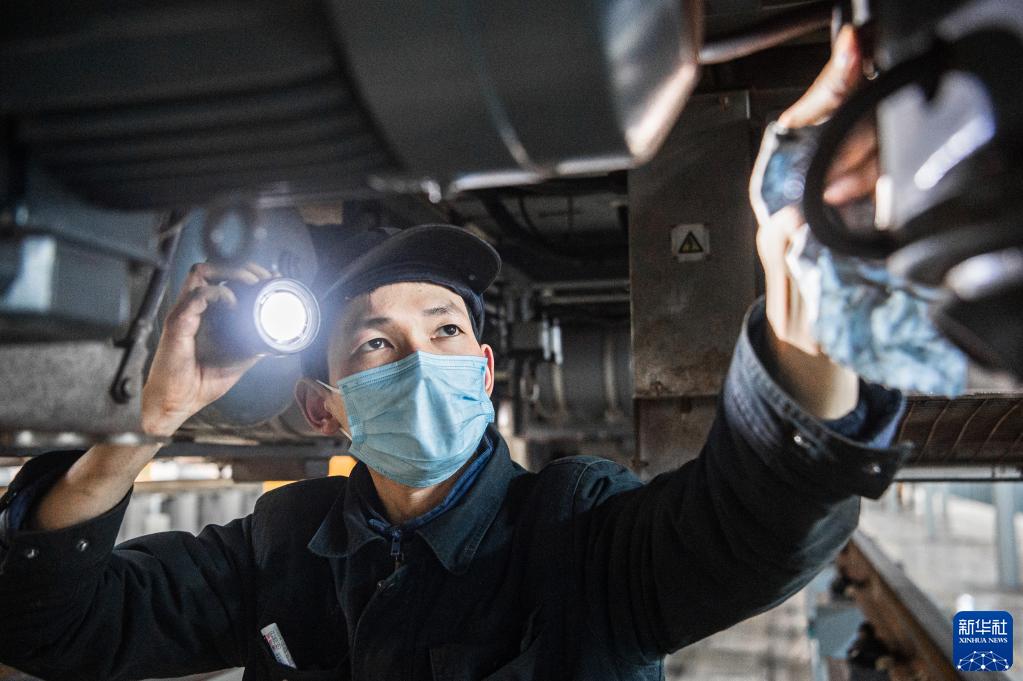 3月23日,武漢地鐵三金潭車(chē)輛段8號線(xiàn)月修庫員工在檢查地鐵車(chē)底部件。
