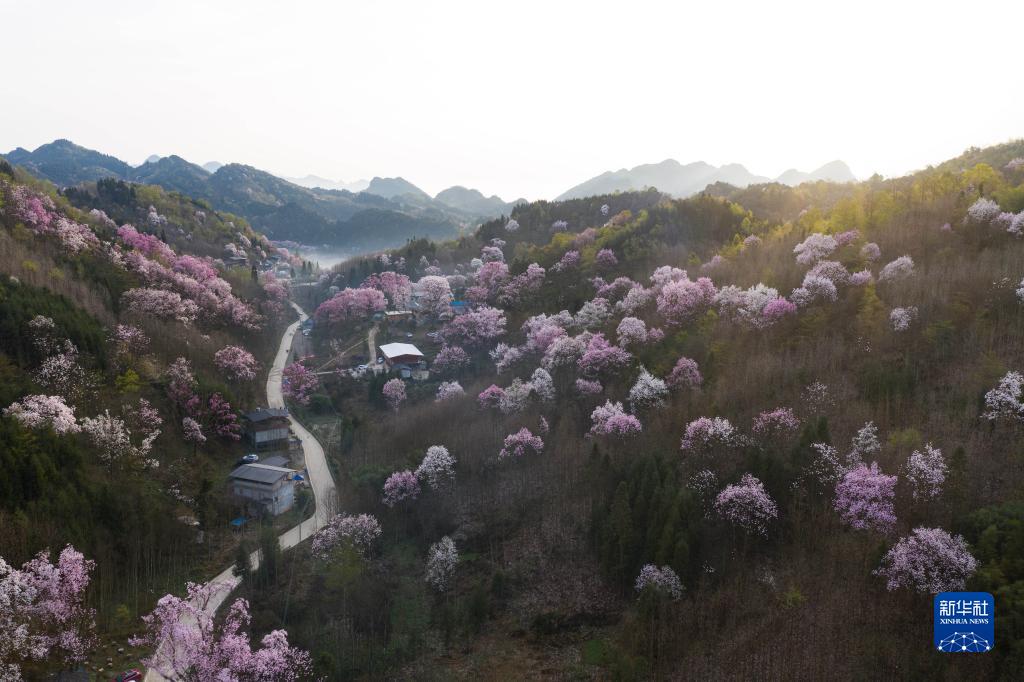 3月23日拍攝的江油市大康鎮戴天山村的辛夷花和民居(無(wú)人機照片)。