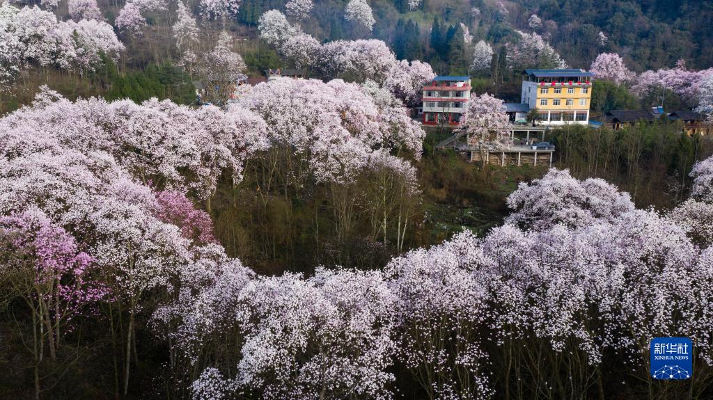 3月23日拍攝的江油市大康鎮戴天山村的辛夷花和民居(無(wú)人機照片)。