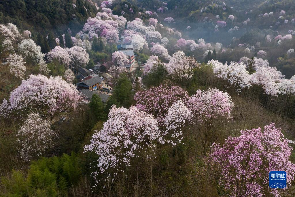 3月23日拍攝的江油市大康鎮戴天山村的辛夷花和民居(無(wú)人機照片)。
