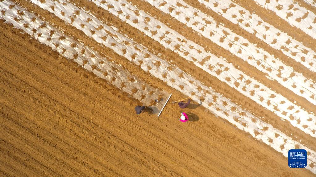 3月23日,山東省聊城市茌平區賈寨鎮前付村村民在田間給種植的花生覆蓋地膜(無(wú)人機照片)。