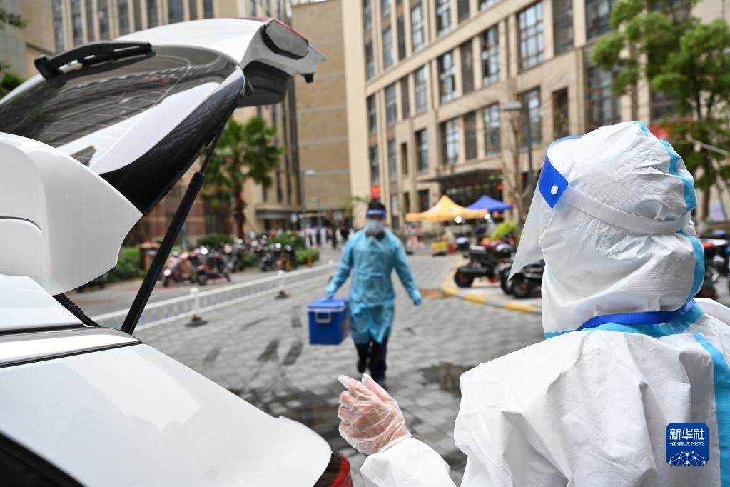 3月24日,在泉州市豐澤區星光耀廣場(chǎng),出租車(chē)司機陳麗珍(右)在等待核酸檢測樣本裝車(chē)。