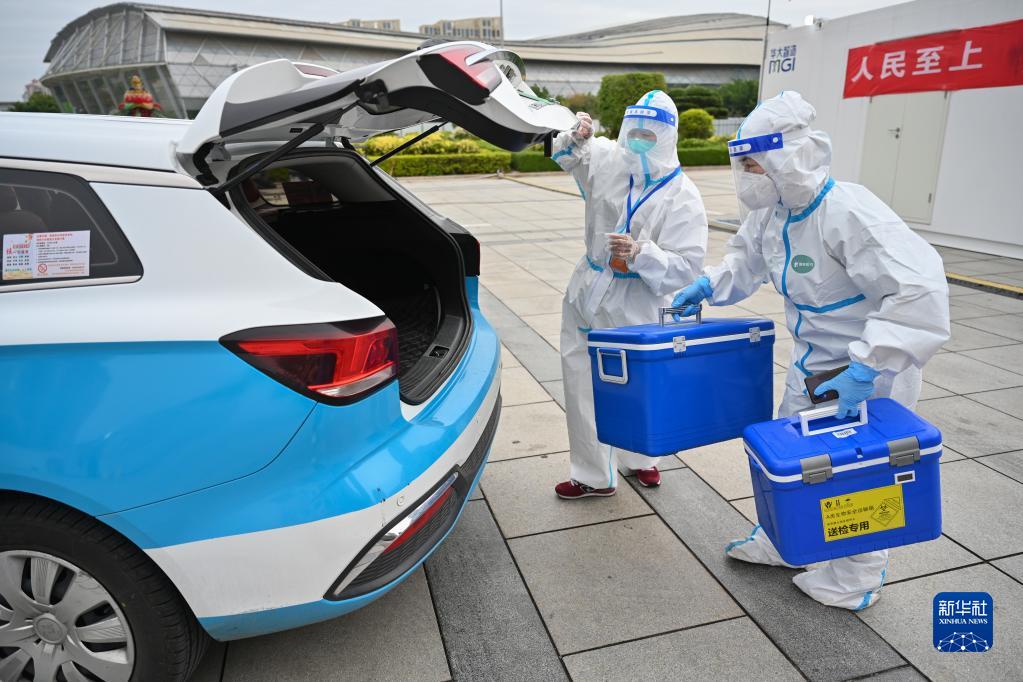 3月24日,在泉州市海峽體育中心聯(lián)合方艙核酸檢測基地,出租車(chē)司機陳麗珍(左)協(xié)助醫務(wù)人員裝運核酸檢測樣本。