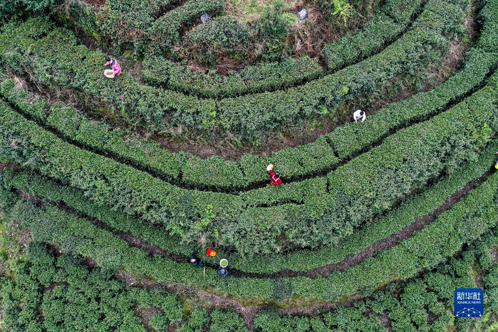 3月24日,村民在重慶市秀山土家族苗族自治縣鐘靈鎮采摘明前茶(無(wú)人機照片)。