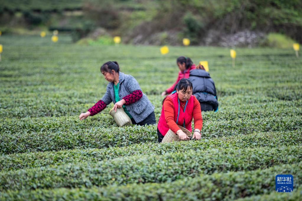 3月24日,村民在重慶市秀山土家族苗族自治縣鐘靈鎮采摘明前茶。