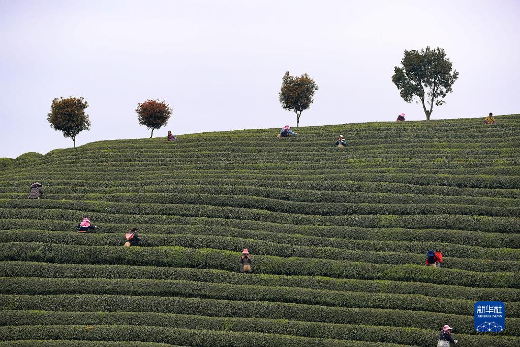 3月24日,茶農在貴州省遵義市余慶縣松煙鎮二龍茶山采摘明前茶。