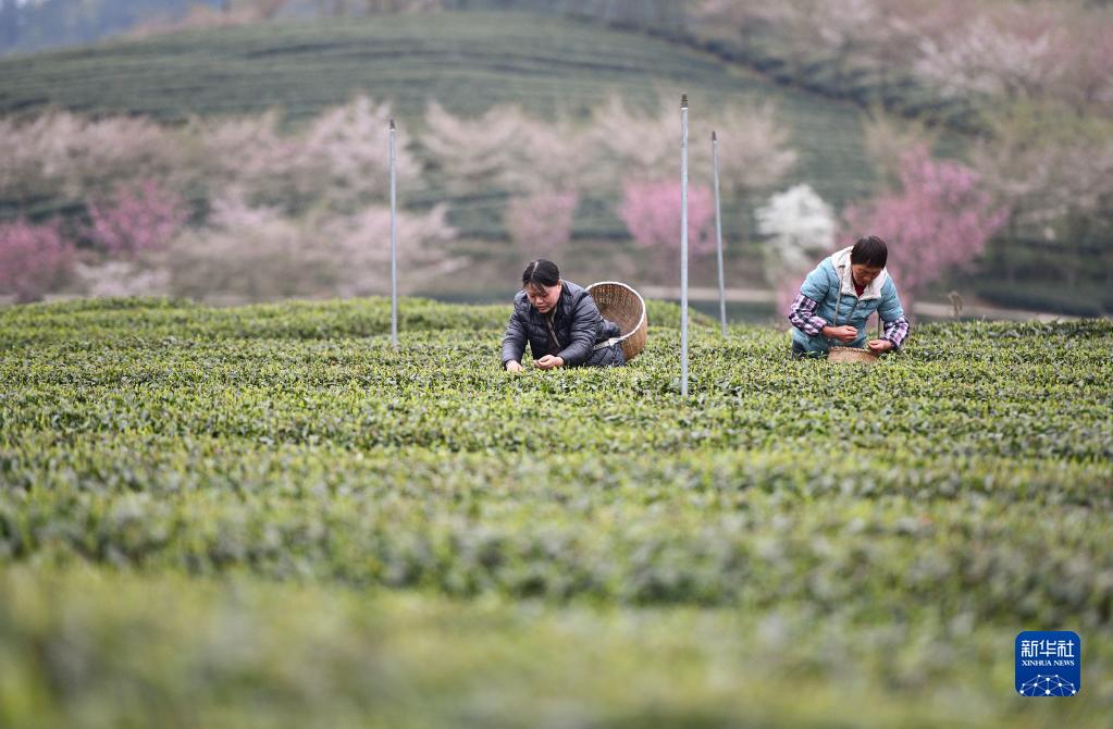 3月24日,茶農在貴州省遵義市余慶縣松煙鎮二龍茶山采摘明前茶。