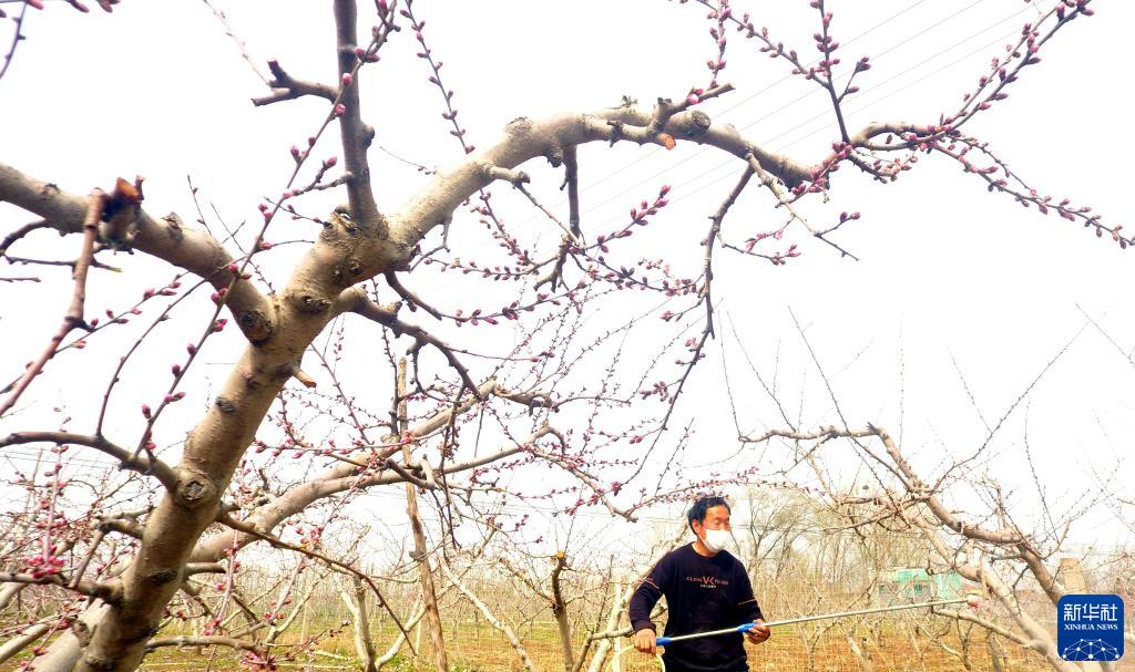 3月26日,山東省聊城市茌平區賈寨鎮前付村的農民在田間給桃樹(shù)噴灑防治病蟲(chóng)害的藥物(無(wú)人機照片)。