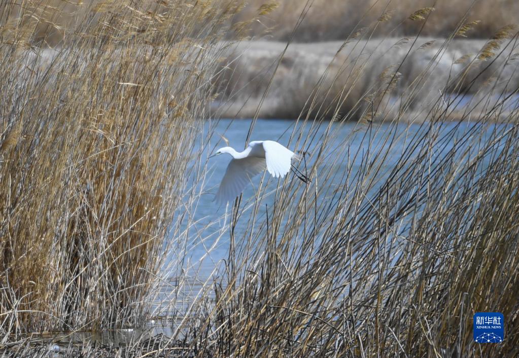 3月30日,一只白鷺在呼和浩特市土默川平原一處蘆葦蕩中飛翔。