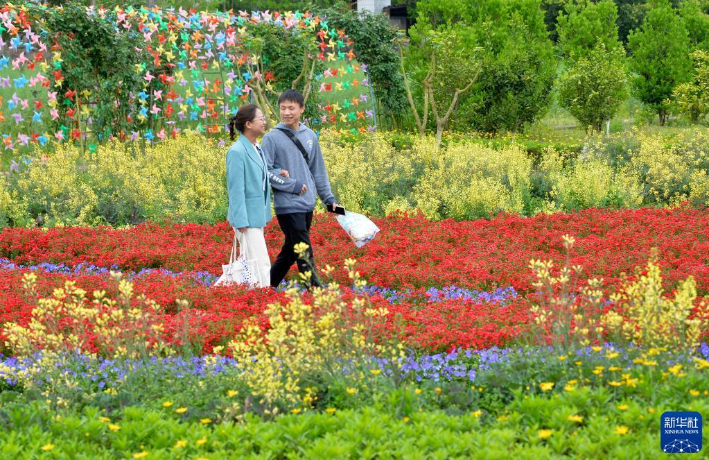 4月4日,游人在四川省廣安市岳池縣銀城花海踏青游玩。