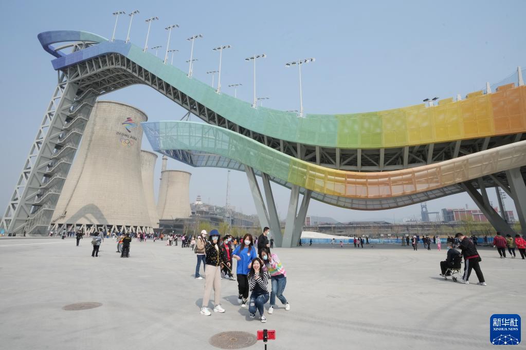 4月4日,游客在北京首鋼滑雪大跳臺區域參觀(guān)游覽。