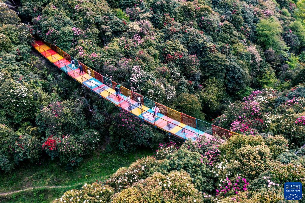 4月4日,游客在貴州省畢節市百里杜鵑金坡景區踏青賞花(無(wú)人機照片)。