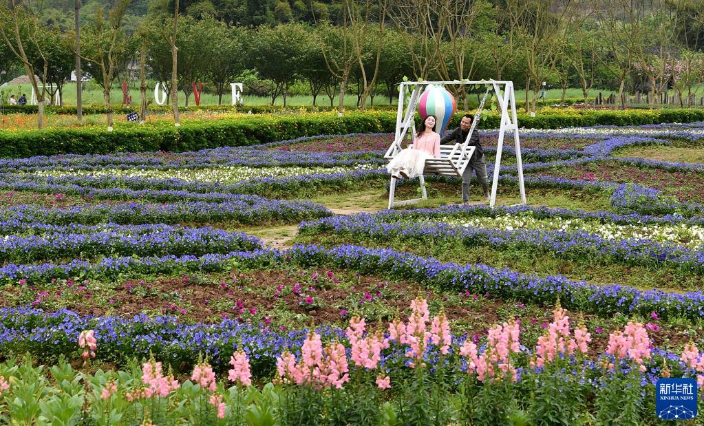 4月4日,游人在四川省廣安市岳池縣銀城花海踏青游玩。