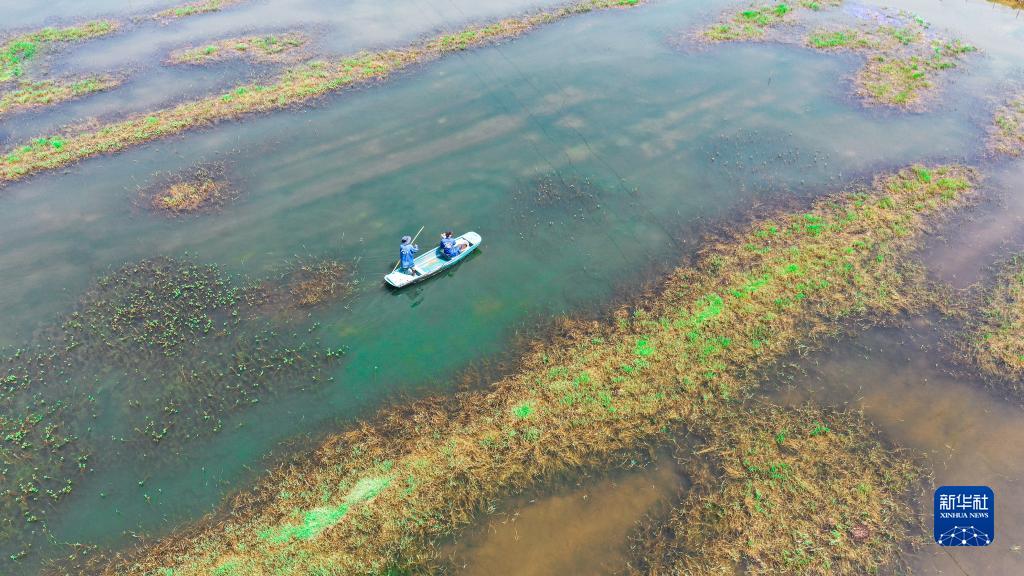 4月6日 ,在湖南省衡陽(yáng)市常寧市板橋鎮新橋村,農民在稻蝦共養稻田里給小龍蝦投放飼料(無(wú)人機照片)。