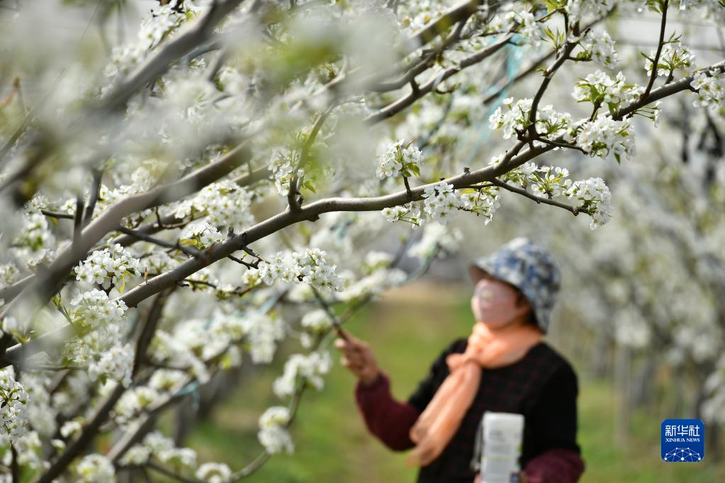 4月10日,梨農在河北滄州泊頭市洼里王鎮后高堯村梨園給梨樹(shù)授粉。