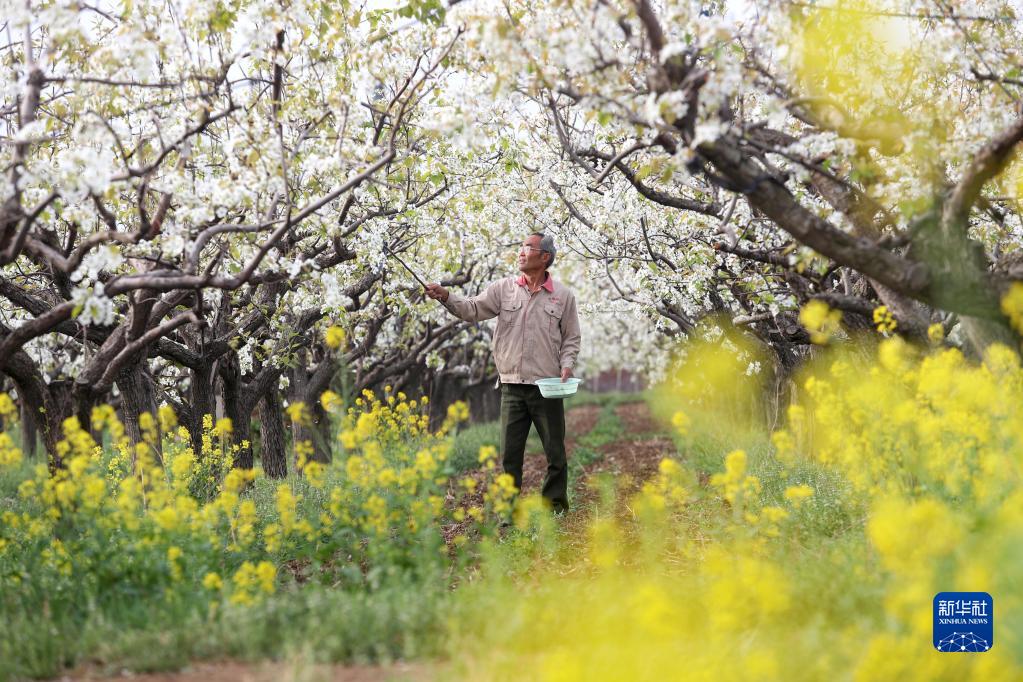 4月12日,河北省石家莊市深澤縣大橋頭鎮農民在為梨花授粉。
