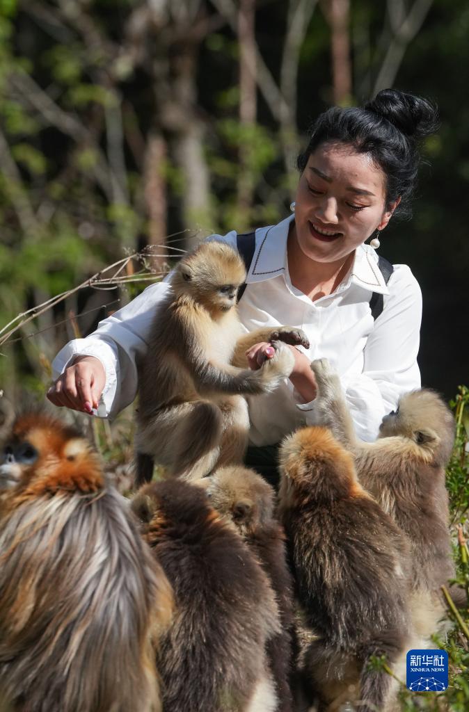 4月26日,在四川白河國家級自然保護區里,工作人員與川金絲猴在一起。