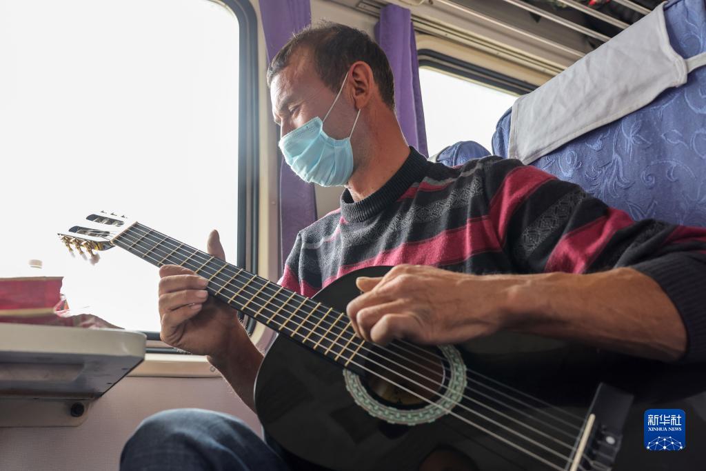 在開(kāi)往和田方向的“和田玉龍號”列車(chē)上,乘客在唱歌彈琴(4月27日攝)。