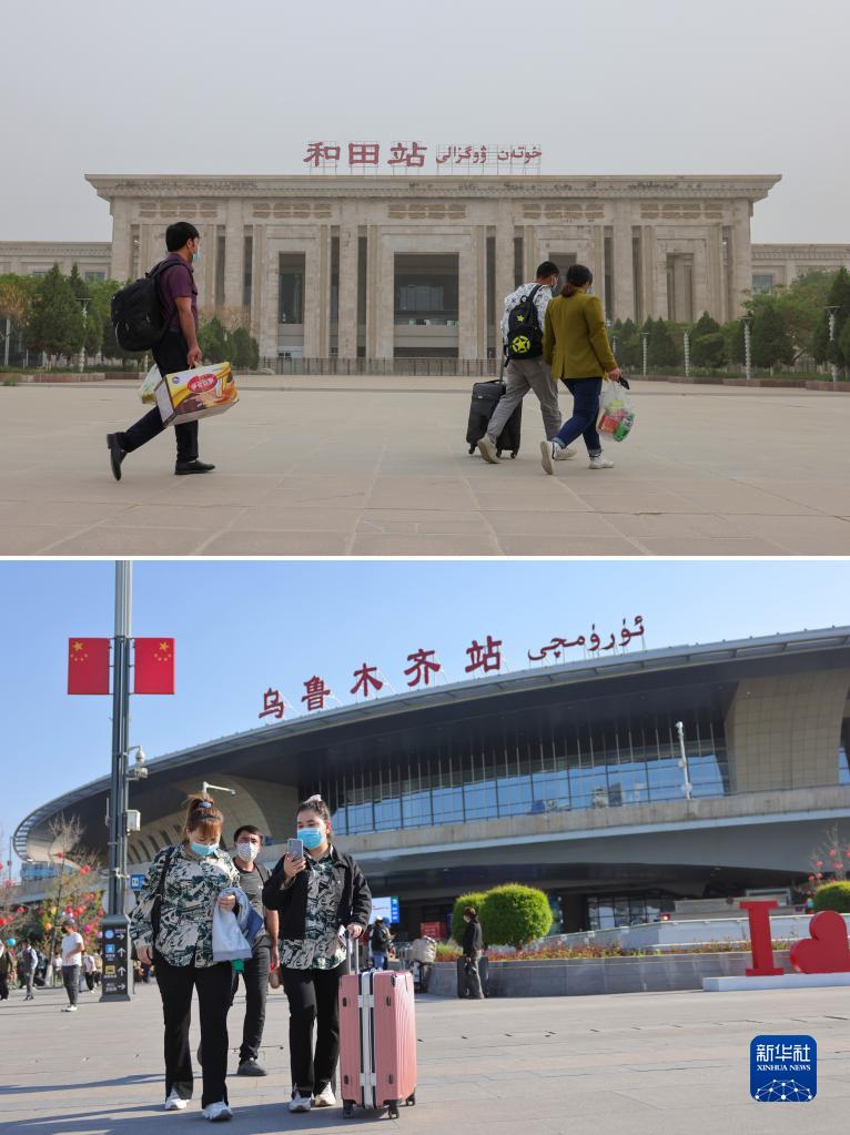拼版照片:上圖為乘坐“和田玉龍號”列車(chē)的旅客在和田火車(chē)站上車(chē)(4月28日攝);下圖為“和田玉龍號”列車(chē)抵達烏魯木齊,乘客走出站房(4月29日攝)。
