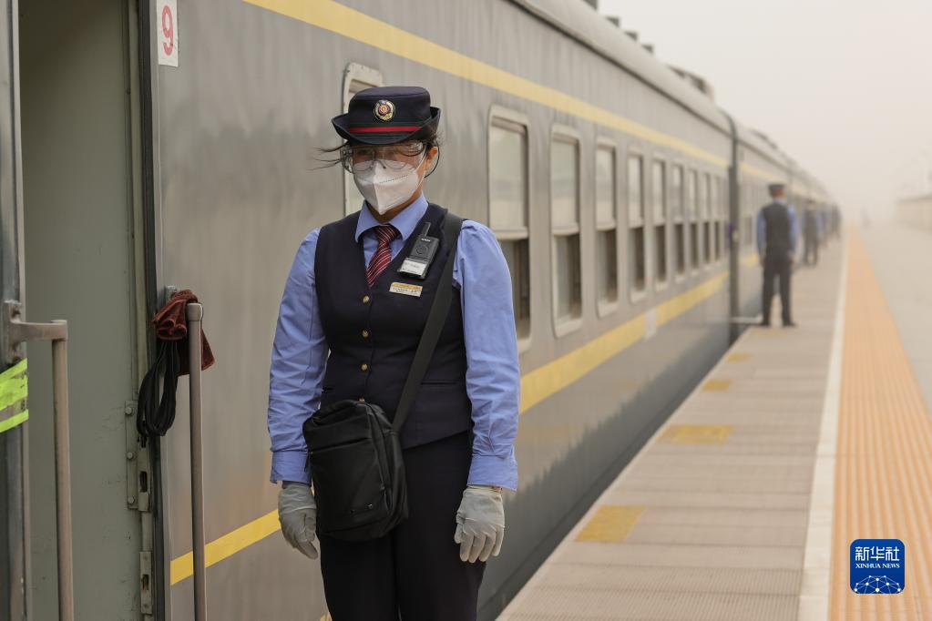 “和田玉龍號”列車(chē)的列車(chē)員在開(kāi)往和田方向的列車(chē)旁立崗等待旅客(4月27日攝)。