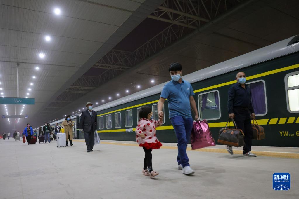 旅客乘坐“和田玉龍號”列車(chē)到達新疆和田火車(chē)站(4月27日攝)。