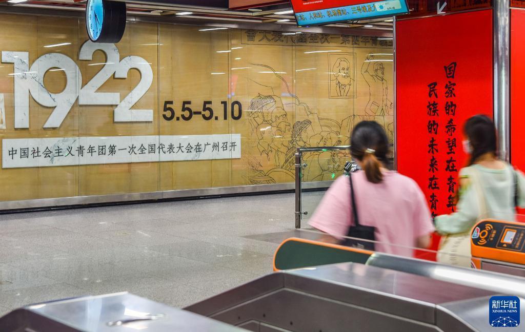 5月3日,修建在團一大會(huì )址附近的廣州地鐵團一大廣場(chǎng)站內的“中國社會(huì )主義青年團第一次全國代表大會(huì )”主題壁畫(huà)。