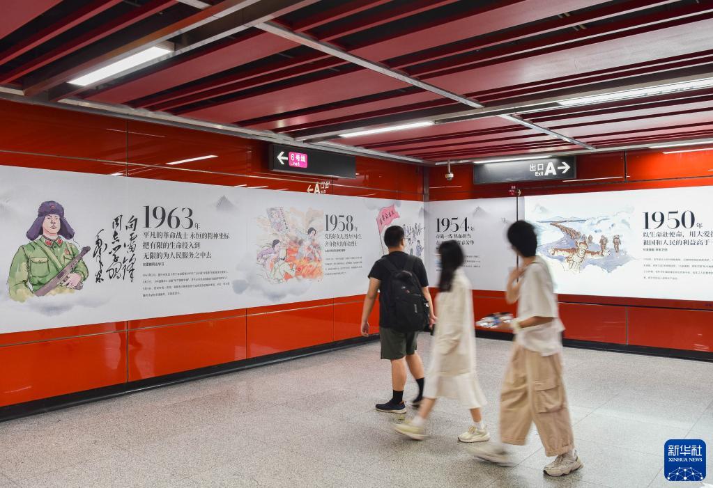 5月3日,乘客在廣州地鐵團一大廣場(chǎng)站內觀(guān)看“無(wú)奮斗不青春”主題宣傳。