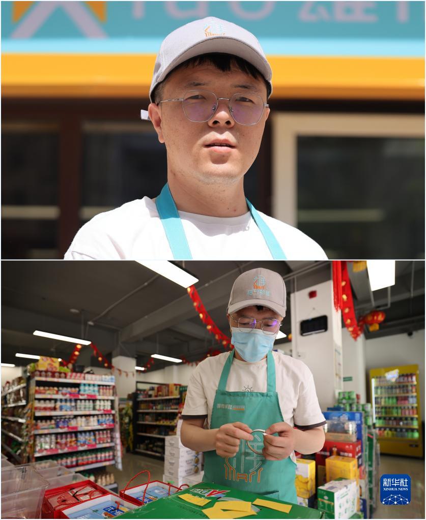 拼版照片:上圖為雄安容東片區“xiao雄mall”便利店店長(cháng)趙王金(4月26日攝);下圖為趙王金在便利店內工作(4月26日攝)。
