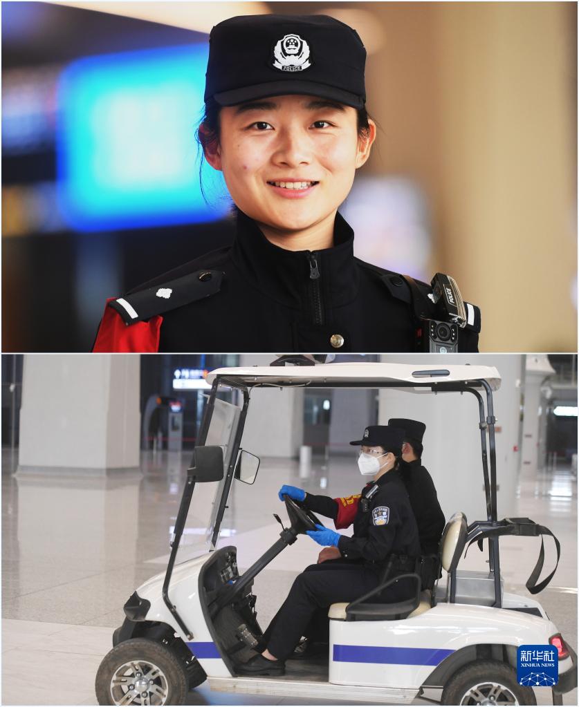 拼版照片:上圖為石家莊鐵路公安處雄安站派出所民警孫明明(4月28日攝);下圖為孫明明在雄安站候車(chē)大廳巡邏(4月28日攝)。