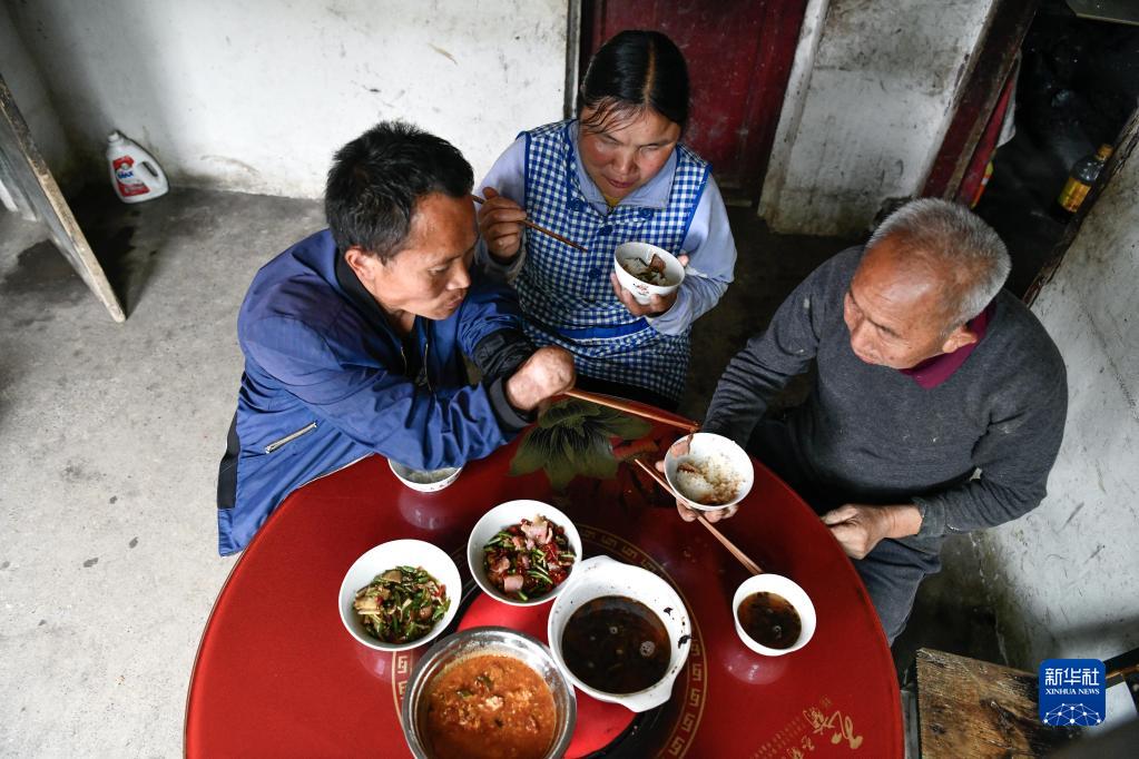 趙友良(左)吃午飯時(shí)給父親夾菜(5月12日攝)。