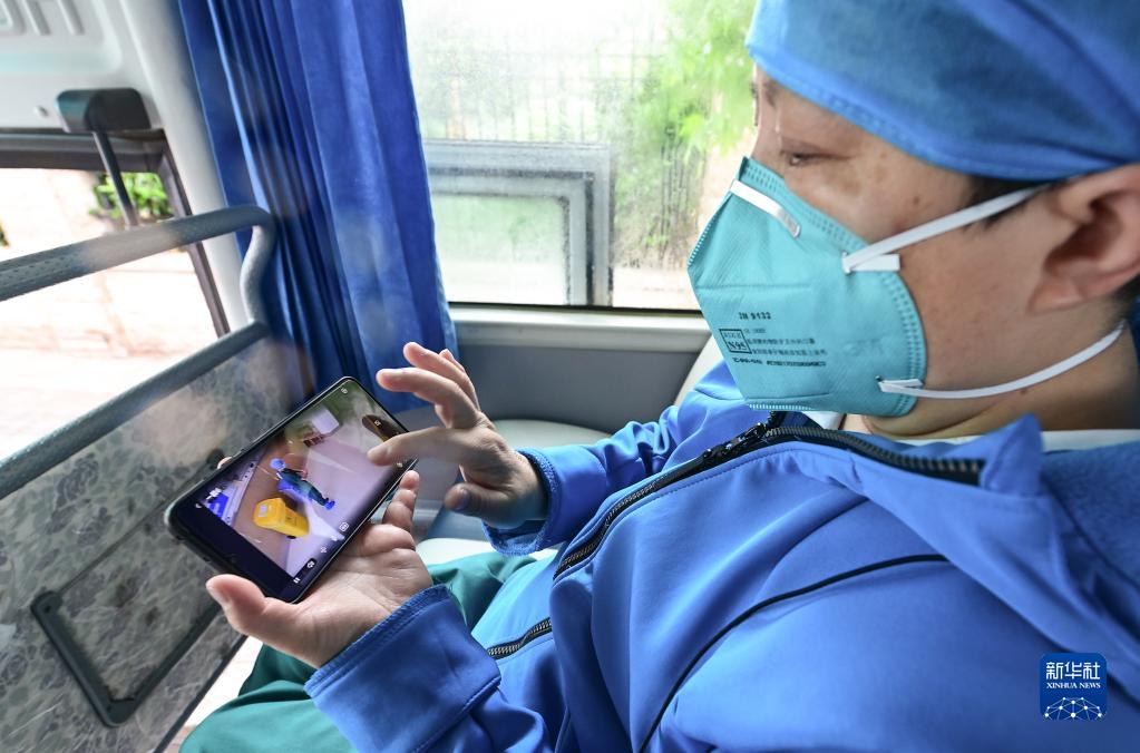 胡鷹鷹在大巴車(chē)上通過(guò)手機實(shí)時(shí)監看醫院“脫衣區”情況(5月13日攝)。