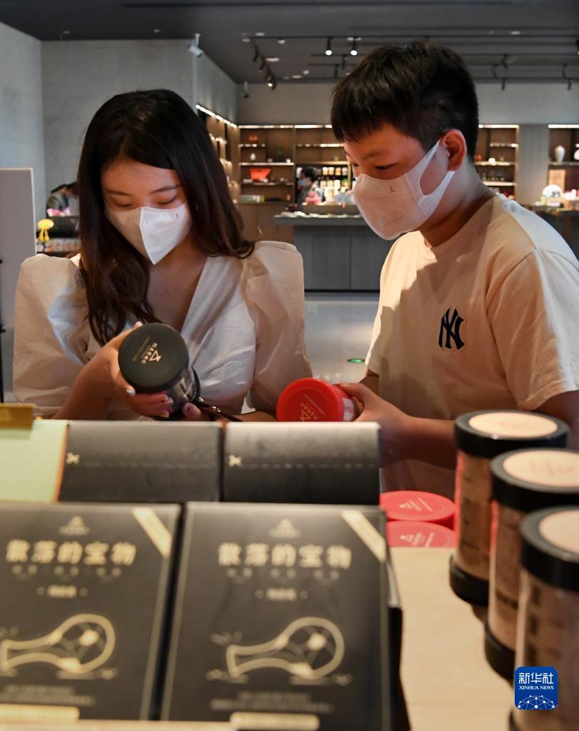 5月17日,兩位參觀(guān)者在河南博物院文創(chuàng )商店內挑選考古盲盒。