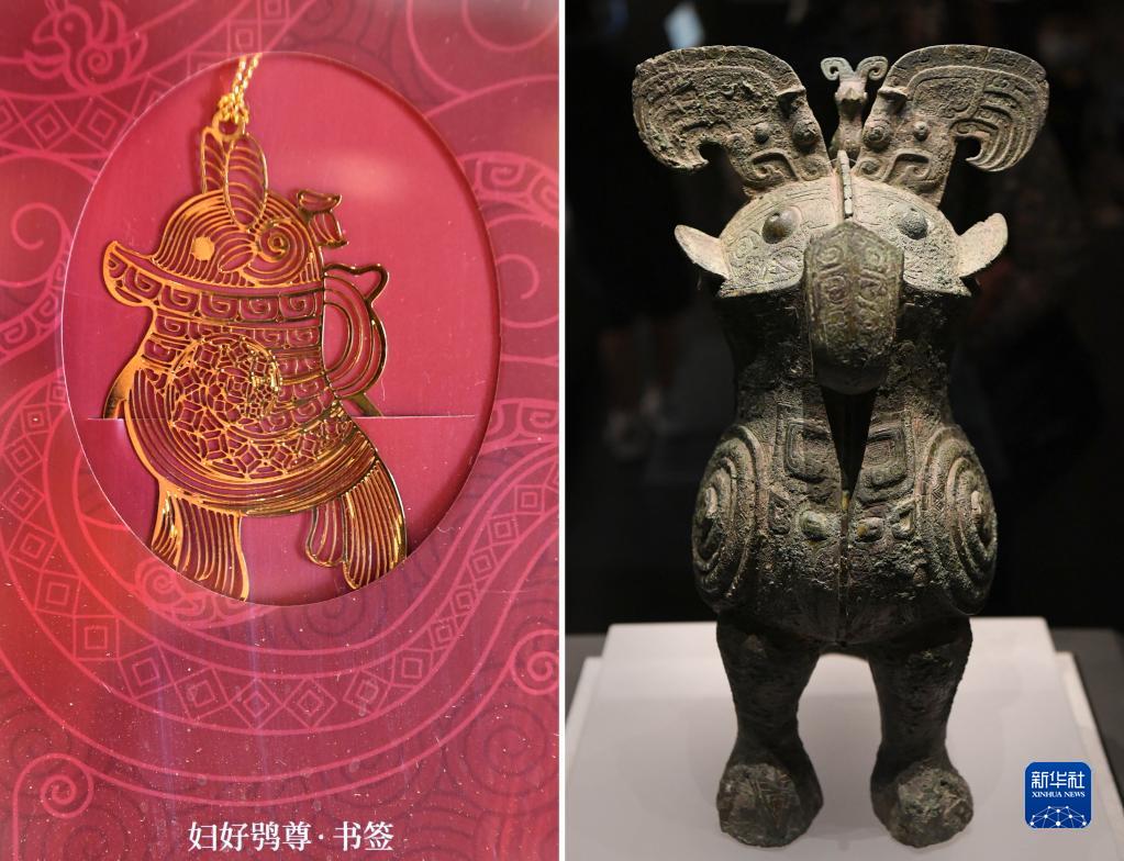 拼版照片:左圖為河南博物院推出的“婦好鸮尊”書(shū)簽;右圖為河南博物院展出的展品“婦好鸮尊”(5月17日攝)。