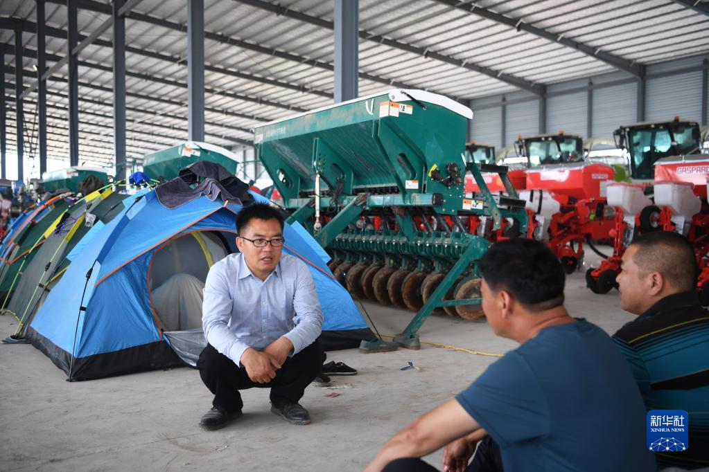 5月25日,在位于河南省鄧州市的公司農機設備停放處,沈興新(左)和農機手交流。