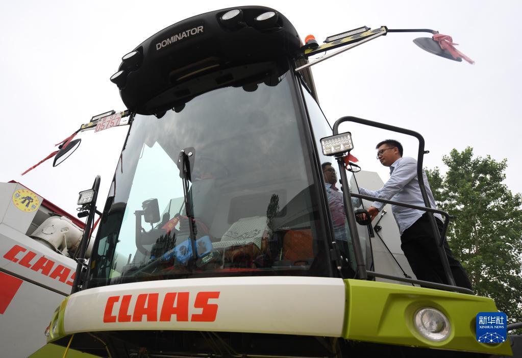 5月25日,在位于河南省鄧州市的公司農機設備停放處,沈興新登上收割機查看設備狀態(tài)。