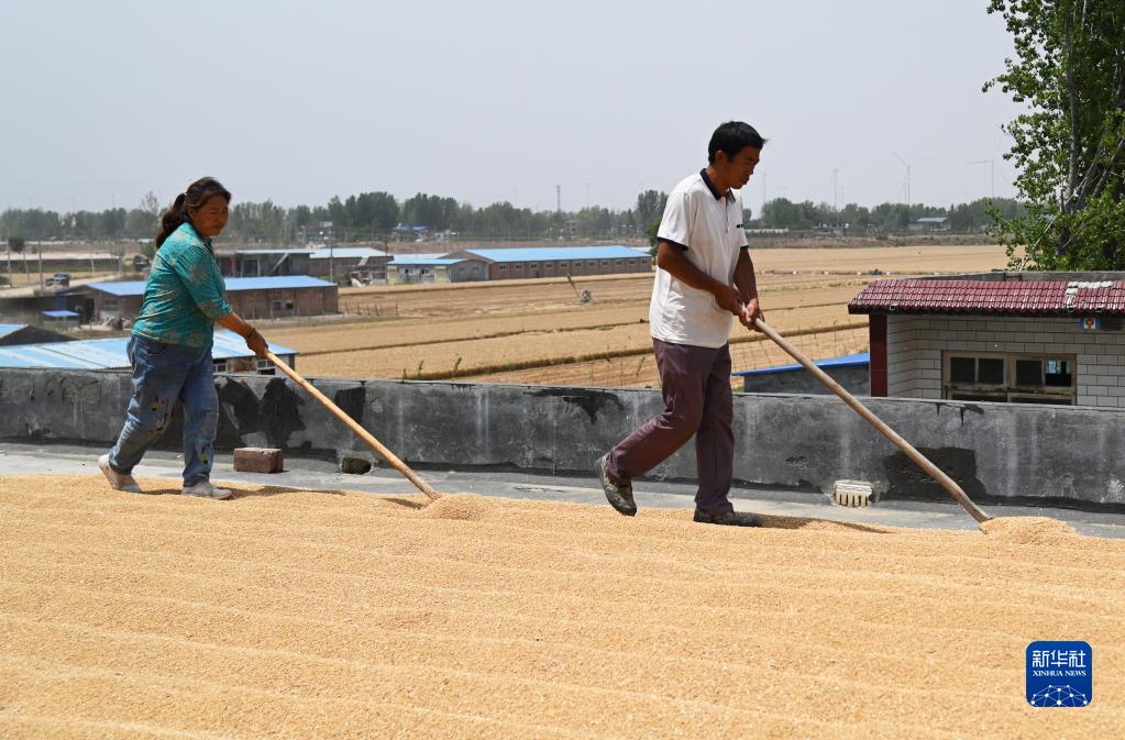 6月7日,在衛輝市劉板橋村,劉建儒(右)和牛玉蘋(píng)在晾曬新麥。