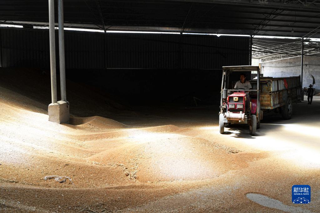 6月7日,劉建儒開(kāi)著(zhù)拖拉機在收糧點(diǎn)準備卸下新麥。