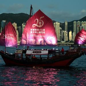 一艘帆船掛上慶祝香港回歸祖國25周年橫幅在維港航行(6月23日攝)。