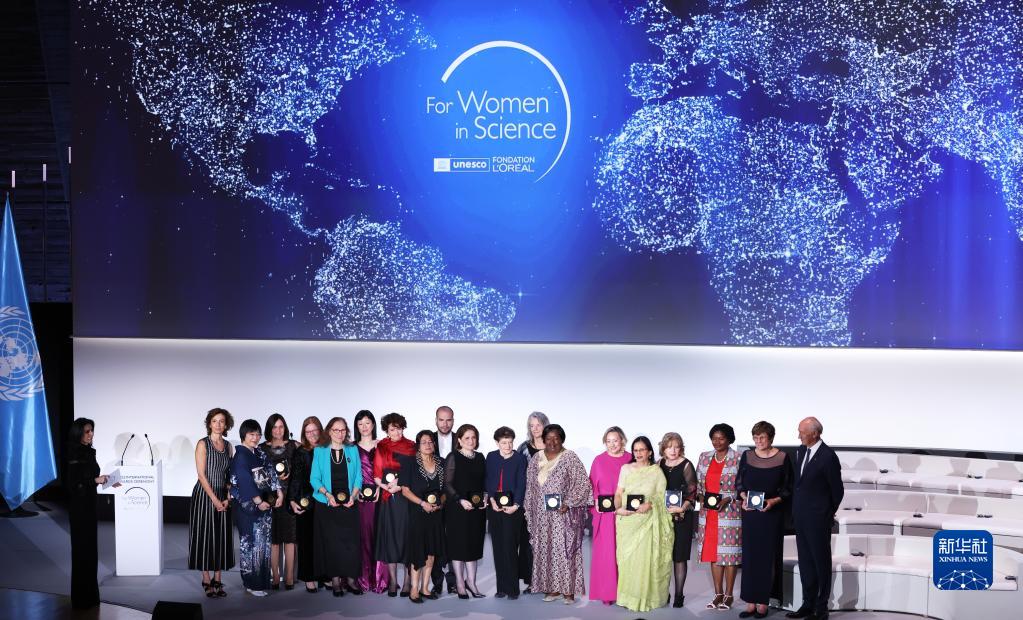 6月23日,在位于法國巴黎的聯(lián)合國教科文總部,榮獲2020、2021、2022年度“世界杰出女科學(xué)家獎”的15位獲獎?wù)吲c聯(lián)合國教科文組織總干事奧德蕾·阿祖萊等在頒獎典禮后合影留念。