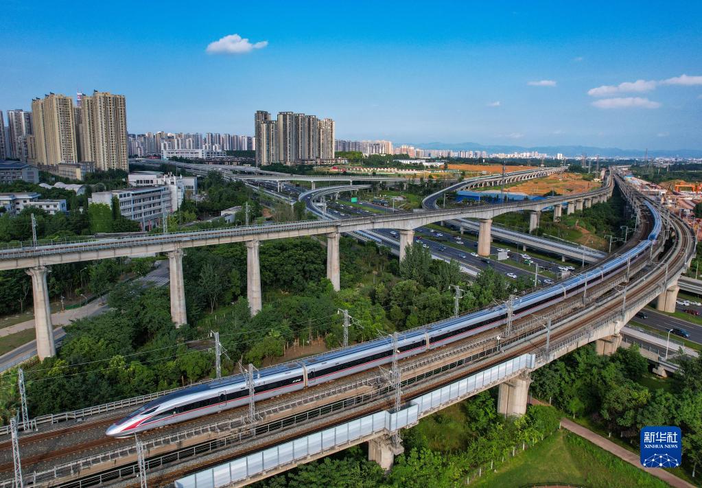 6月24日,復興號動(dòng)車(chē)組行駛在成渝城際鐵路上(無(wú)人機照片)。